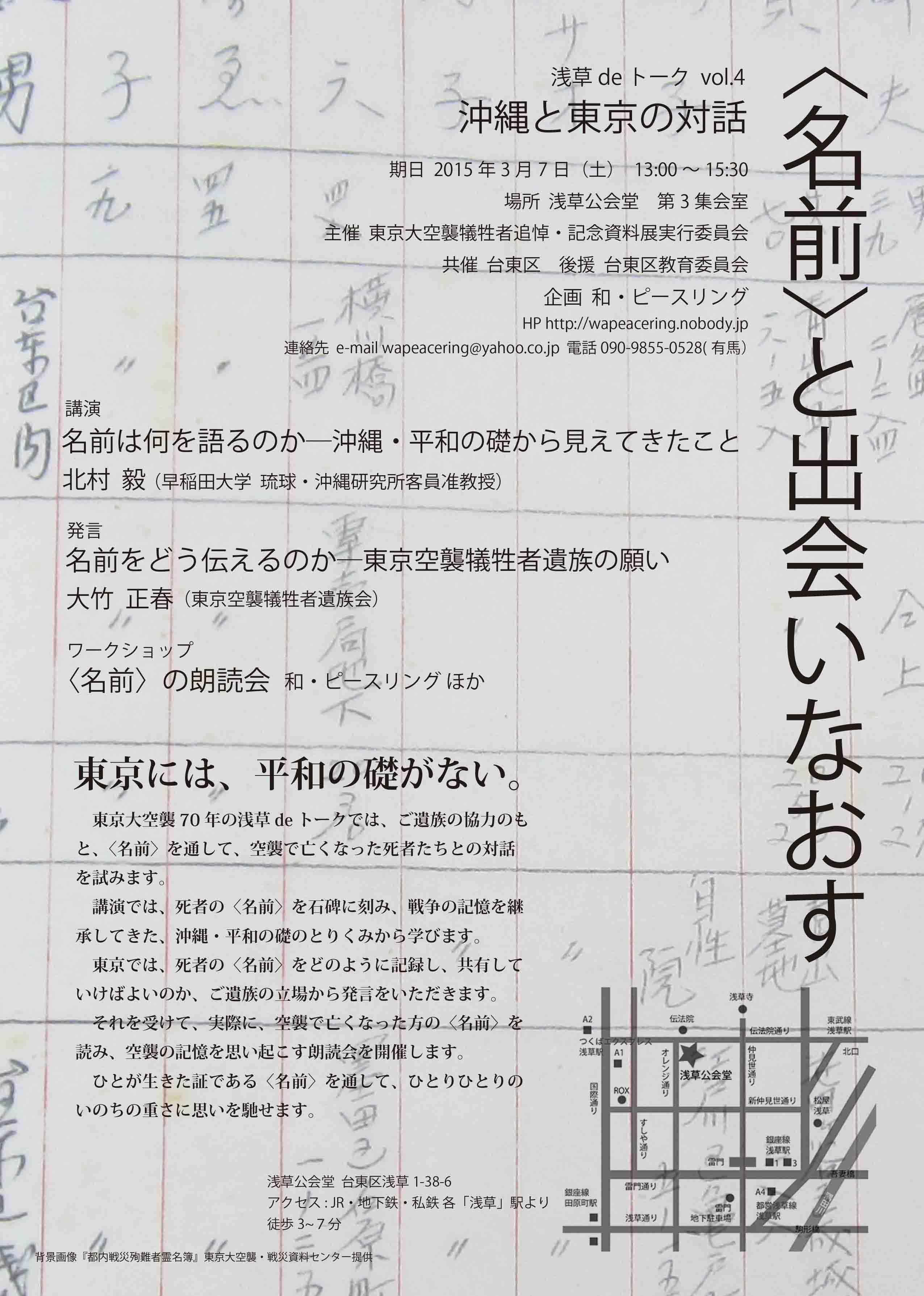 東京大空襲70年の浅草 de トークでは、ご遺族の協力のもと〈名前〉を通して空襲で亡くなった死者たちとの対話を試みます。講演では、死者の〈名前〉を石碑に刻み戦争の記憶を継承してきた、沖縄・平和の礎のとりくみから学びます。東京では死者の〈名前〉をどのように記録し共有していけばよいのか、ご遺族の立場から発言をいただきます。それを受けて、実際に空襲で亡くなった方の〈名前〉を読み、空襲の記録を思い起こす朗読会を開催します。